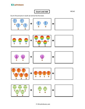 Our addition with picture worksheets help kids learn math by using visual aids like objects, dice, and dominoes to practice addition. Experience hands-on learning with exercises like counting and adding pictures, counting squares to find the sums, framing addition sentences, solving problems with dice and dominoes, and more!