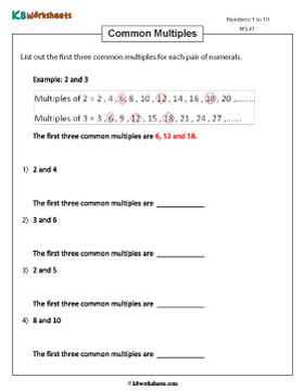 Our free least common multiple worksheets provide practice in identifying the lowest multiple shared by two or more numbers. Our printable exercises start with finding common multiples for pairs of numbers 1 to 10 and extend to 100, and groups of three numbers across different ranges, including two-digit and larger numbers.