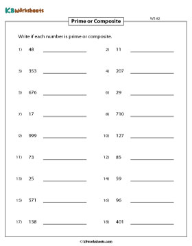 Our identifying prime and composite numbers worksheets are a must-try! Kids work through 18 numbers, distinguishing between prime and composite. A prime number is divisible only by 1 and itself, while a composite number has more than two divisors. For instance, 7 is prime because it can be evenly divided by 1 and 7, whereas 12 is composite as it can be divided by 1, 2, 3, 4, 6, and 12.