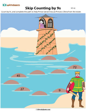 These skip counting by 9s worksheets invite kids to the fantasy land of princes and princesses. Hop forward by nine each time and help the prince cross enchanted forests, climb towers, cross oceans, and reunite with their princess. Don’t forget to fill in missing numbers by counting forward and backward by 9s.