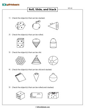 With our worksheets on roll, slide, and stack, kids visualize and experiment with the movement of different solid shapes. They learn how different 3D shapes behave when rolled, slid, or stacked and record their observations to complete a table. Watch them identify and check real-life lookalikes of 3-dimensional shapes based on their movements.